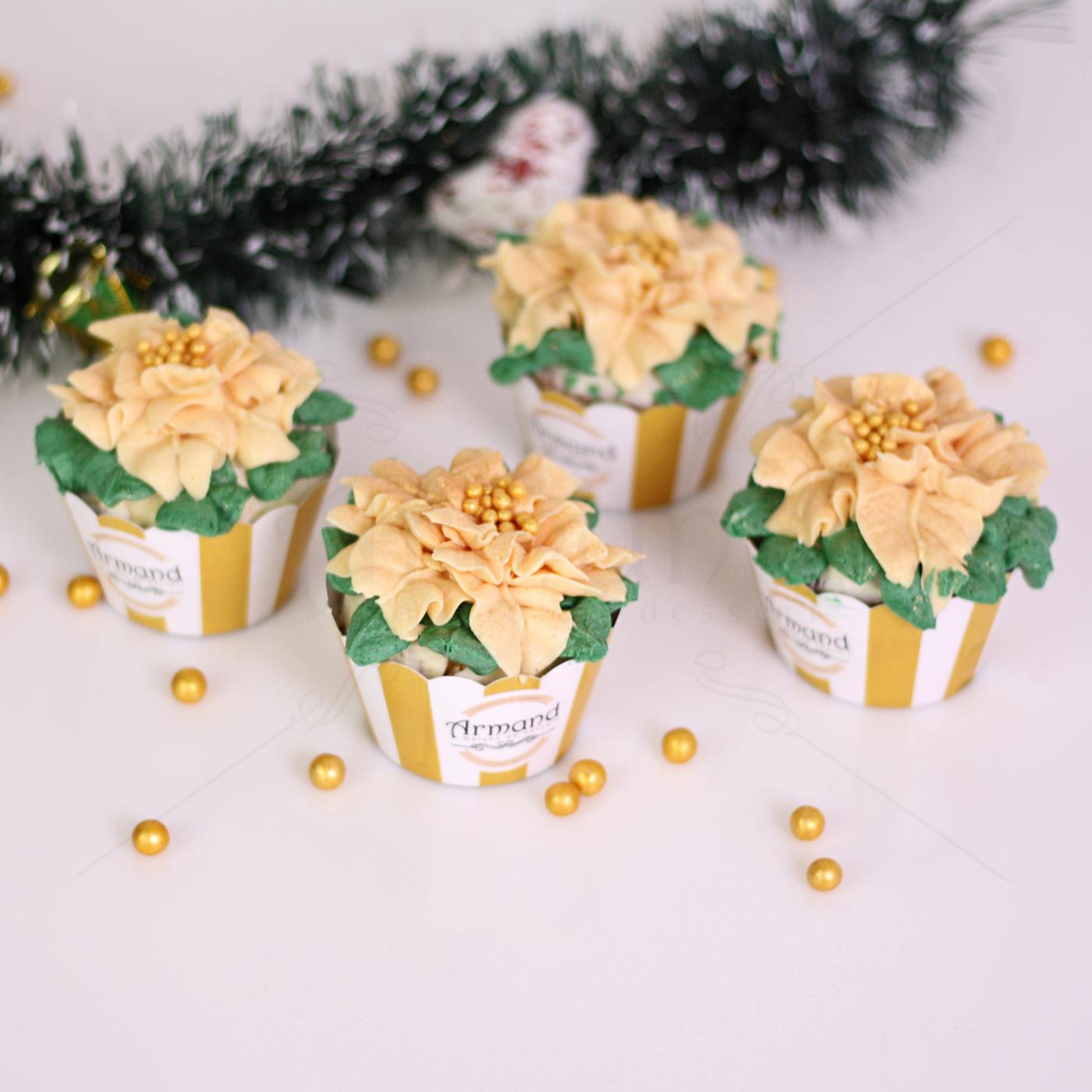 Acest cupcake rafinat aduce eleganța și strălucirea florii de Crăciun (Poinsettia) direct pe masa dumneavoastră!Blatul pufos este acoperit cu o cremă delicioasă, modelată cu măiestrie sub forma unei flori Poinsettia cu petale delicate, în nuanțe calde de auriu și bej
