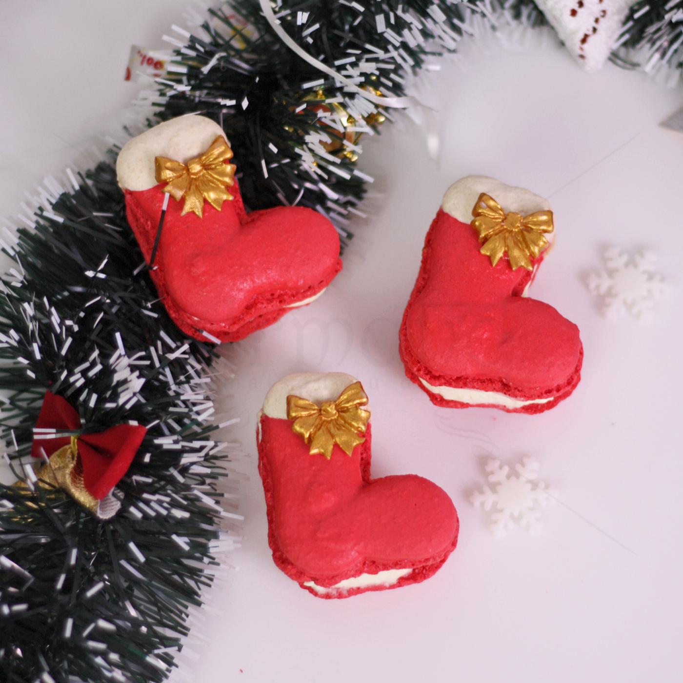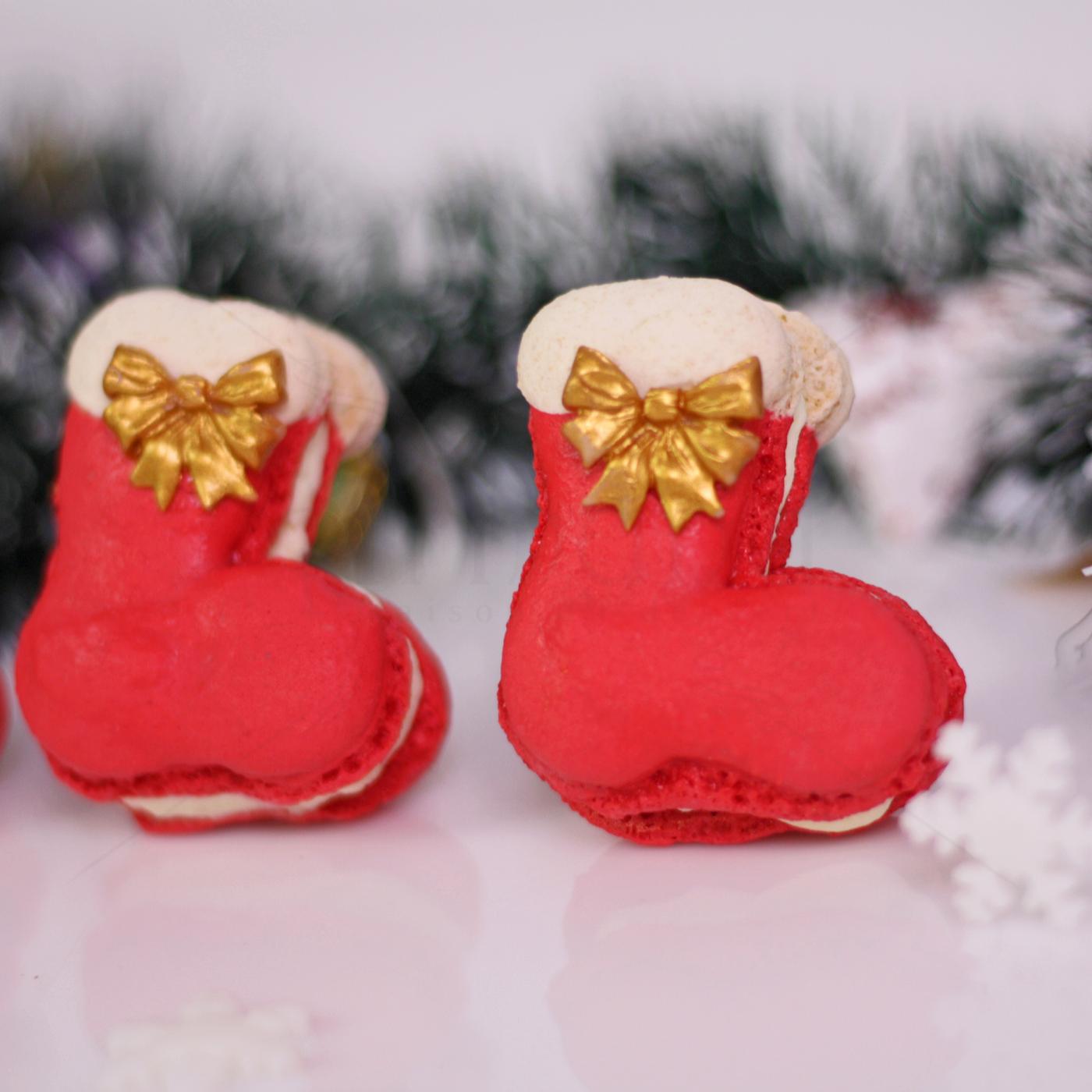 Acest macaron roșu intens aduce un plus de veselie festivă! Modelat cu migală în forma clasică de cizmuliță a lui Moș Crăciun, este umplut cu o cremă fină cu aroma de capsuni. O fundiță aurie comestibilă, aplicată manual, adaugă o notă de eleganță și strălucire.