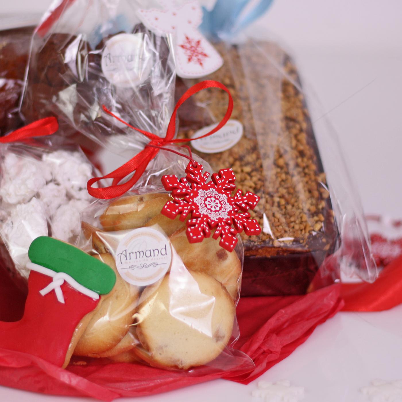 Un pachet special creat pentru a satisface toate gusturile si contine; un mini cozonac , un delicios chec marmorat cu ciocolata , trufe cu ciocolata si aroma portocala, bezele cu arahide, cocos si ciocolata, biscuiti cu nuca , fursec cu stafide si o turta dulce disponibila in stoc din colectia figurine personalizate Craciun .