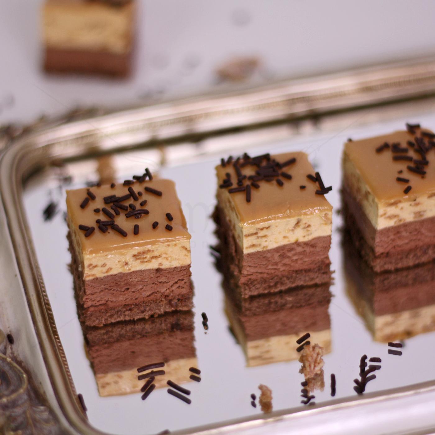 mousse caramel 31.4% {crema caramel 28,2% [lapte degresat condensat indulcit, zahar, sirop de glucoza-fructoza, zahar caramelizat 14%, apa, grasimi vegetale total hidrogenate (cocos), ulei de cocos, agent de ingrosare:pectine, sare, regulator de aciditate: citrat de sodiu, emulgatoar: lecitine, agent de intarire: clorura de calciu], frisca (smantana, proteine din lapte, inulina din cicoare), crema patiserie [apă, ulei din sâmburi de palmier (total hidrogenat) 25%, zahar, dextroza, agenti de ingrosare: sorbitol, sirop de glucoza, amidon, stabilizatori: hidroxipropilmetilceluloza, carboximetilceluloza, emulgatori: monostearat de polioxietilenă sorbitan, mono- și digliceride ale acizilor grași, esteri poliglicerici ai acizilor grași, stearoil-2-lactilat de sodiu, sare, arome, colorant: caroteni], pasta crocanta [biscuiti crocanti (faina alba de grau, zahar, unt concentrat, ulei vegetal de floarea soarelui, lapte praf degresat, malt de orz, sare), surogat ciocolata alba [zahar, grasimi vegetale (samburi de palmier) lapte praf semidegresat, zer praf, emulgator: lecitina de floarea soarelui, aroma naturala de vanilie], lapte pasteurizat, gelatina (conservant: metabisulfit de sodiu)]}, mousse negru 31.4% {frisca (smantana, proteine din lapte, inulina din cicoare), crema patiserie [apă, ulei din sâmburi de palmier (total hidrogenat) 25%, zahar, dextroza, agenti de ingrosare: sorbitol, sirop de glucoza, amidon, stabilizatori: hidroxipropilmetilceluloza, carboximetilceluloza, emulgatori: monostearat de polioxietilenă sorbitan, mono- și digliceride ale acizilor grași, esteri poliglicerici ai acizilor grași, stearoil-2-lactilat de sodiu, sare, arome, colorant: caroteni], surogat ciocolata neagra (zahăr, grăsime vegetală parțial hidrogenată (sâmburi de palmier, nucă de cocos), pudră de cacao cu conținut scăzut de grăsimi (16%), emulgator lecitină din soia, arome), lapte pasteurizat, gelatina (conservant:matabisulfit de sodiu)}, glasaj [glazura {surogat ciocolata neagra (zahăr, grăsime vegetală parțial hidrogenată (sâmburi de palmier, nucă de cocos), pudră de cacao cu conținut scăzut de grăsimi (16%), emulgator lecitină din soia, arome), frisca (smantana, proteine din lapte, inulina din cicoare), crema patiserie [apă, ulei din sâmburi de palmier (total hidrogenat) 25%, zahar, dextroza, agenti de ingrosare: sorbitol, sirop de glucoza, amidon, stabilizatori: hidroxipropilmetilceluloza, carboximetilceluloza, emulgatori: monostearat de polioxietilenă sorbitan, mono- și digliceride ale acizilor grași, esteri poliglicerici ai acizilor grași, stearoil-2-lactilat de sodiu, sare, arome, colorant: caroteni], unt, gelatina (conservant:metabisulfit de sodiu