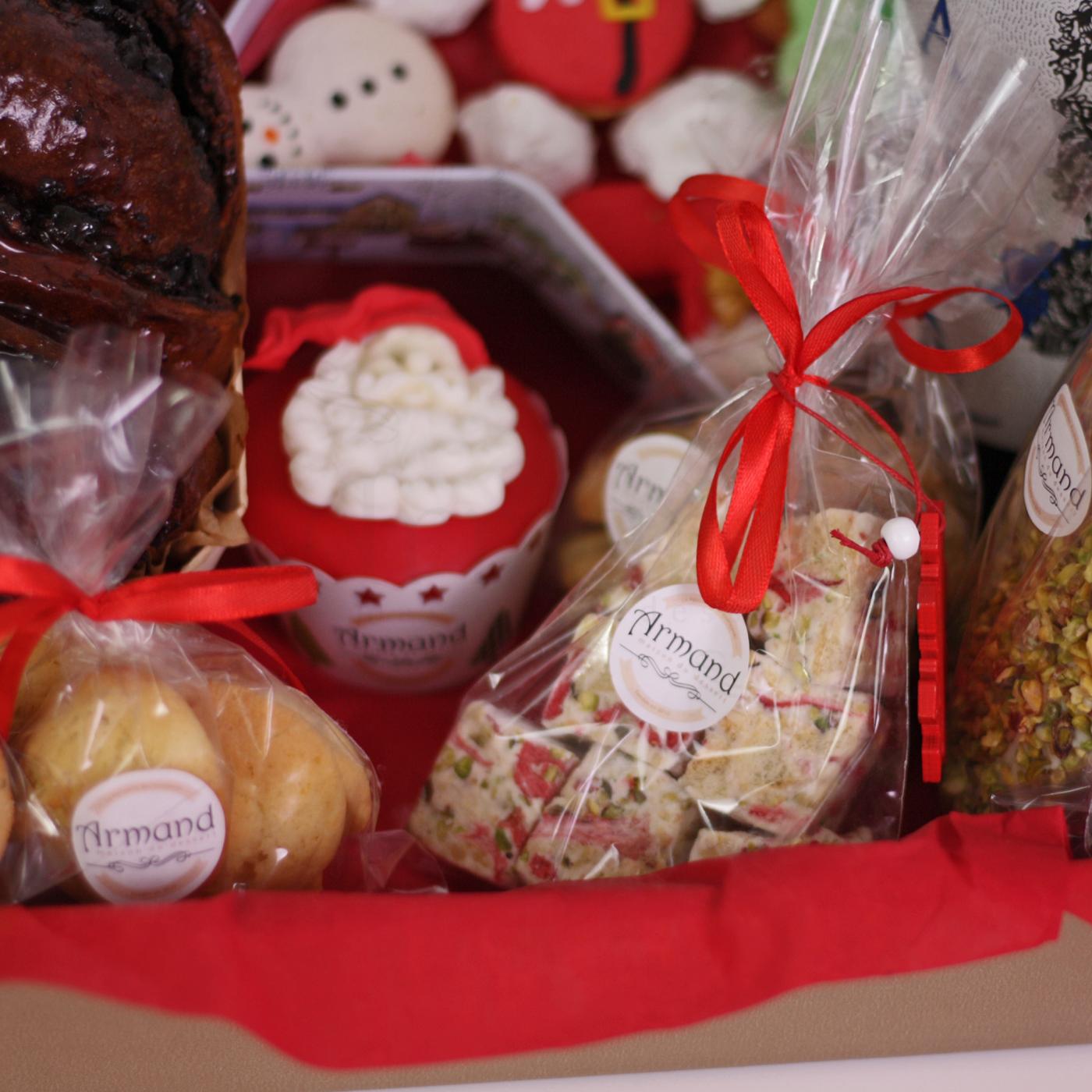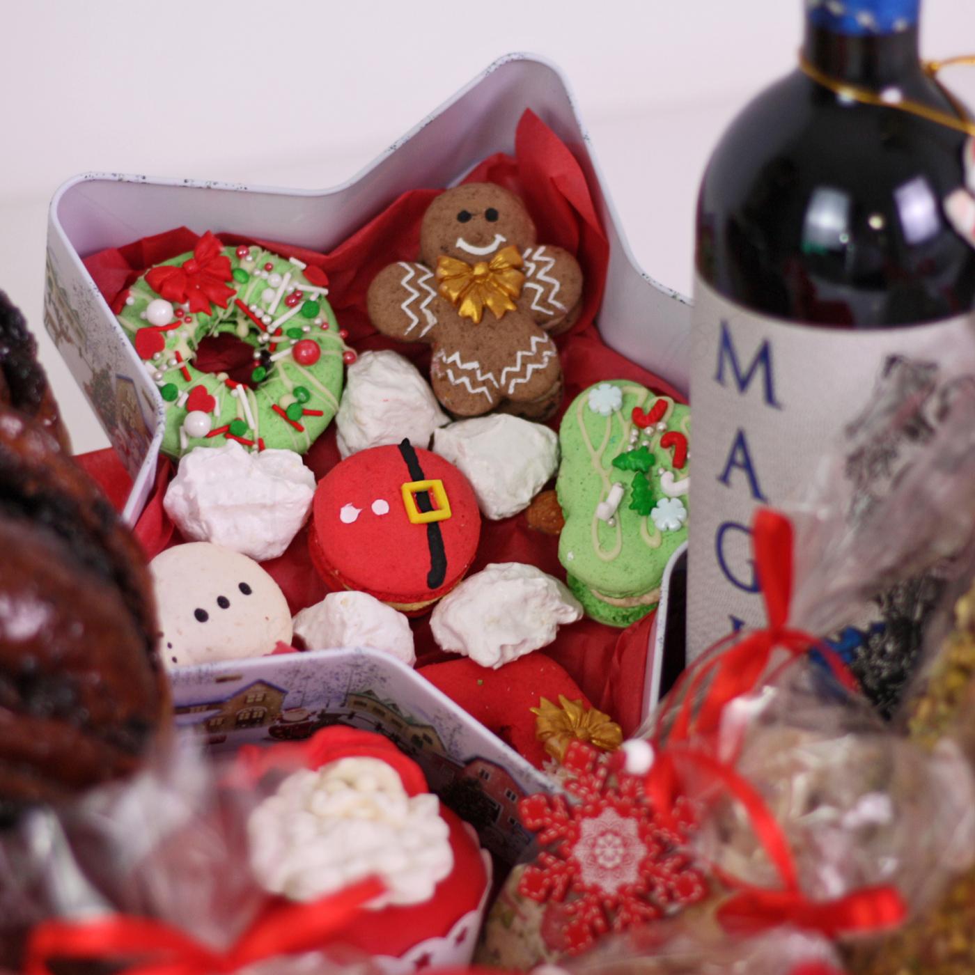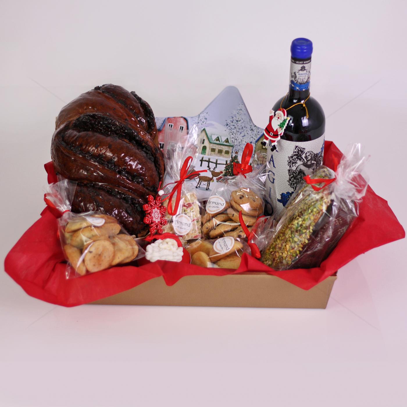 Un pachet creat special pentru famile sau prieteni sau cadouri corporate. Avem o tavita cadou plina cu bunatati Armand: deliciosul cozonac insiropat, o sticla cu vin rosu , un chec pufos umplut cu visine si imbracat in fistic, trei sortimente de biscuiti fragezi , un cupcake cu tematica de Craciun si o cutie metalica in forma de stea in care am asezat 5 macarons cu temtica de Craciun insotiti de minunatele bezele pline cu arahide, cocos si ciocolata.