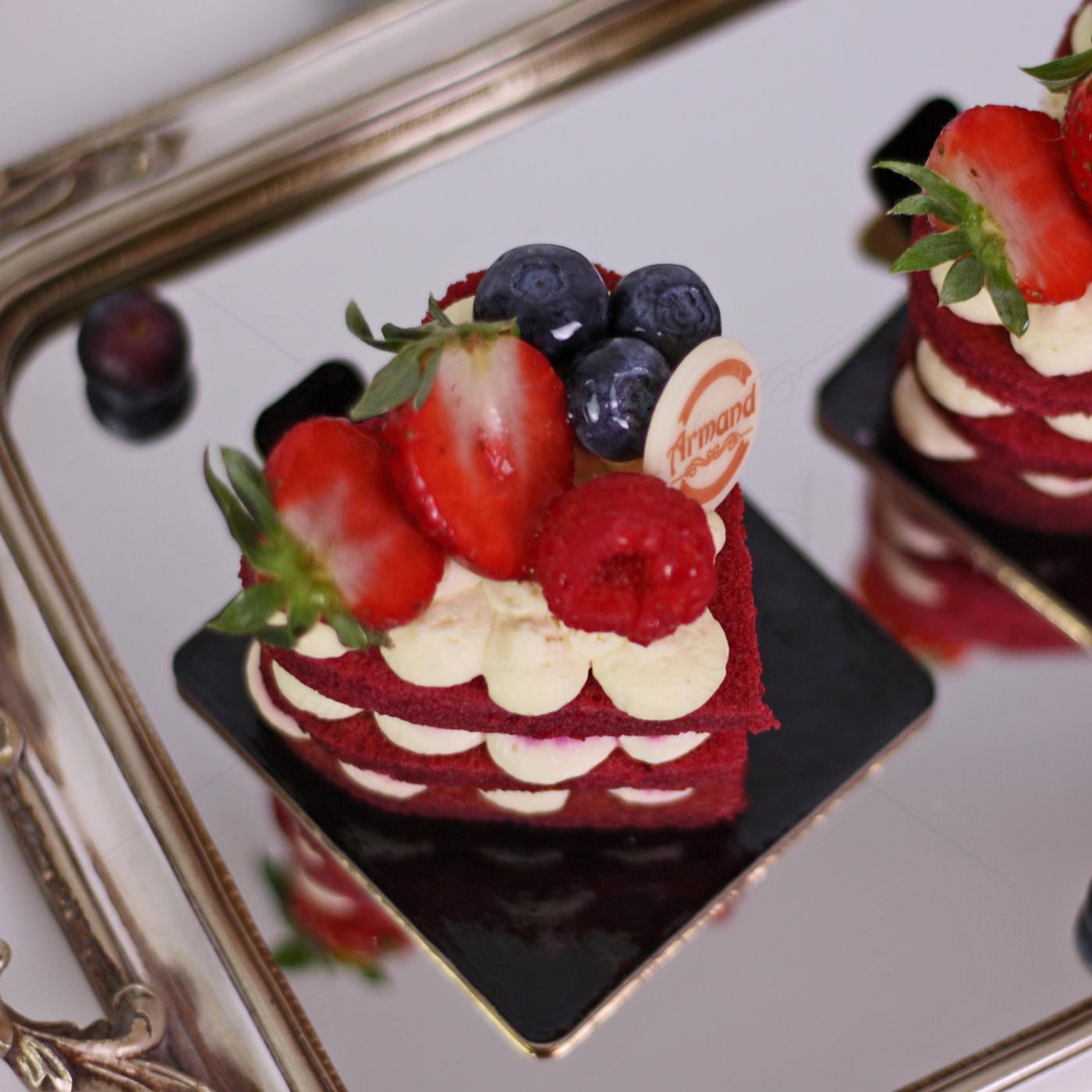 Ingredinte: Mix red velvet, colorant natural din sfecla rosie, albus, galbenus,unt, lichior Cointreau, crema de branza, frisca naturala, zmeura, mure, afine si capsuni.Alergeni: capsuni, lactoza, gluten, ou, poate contine urme de fructe cu coaja lemnoasa.