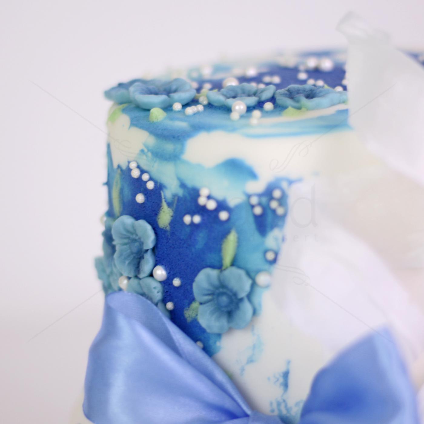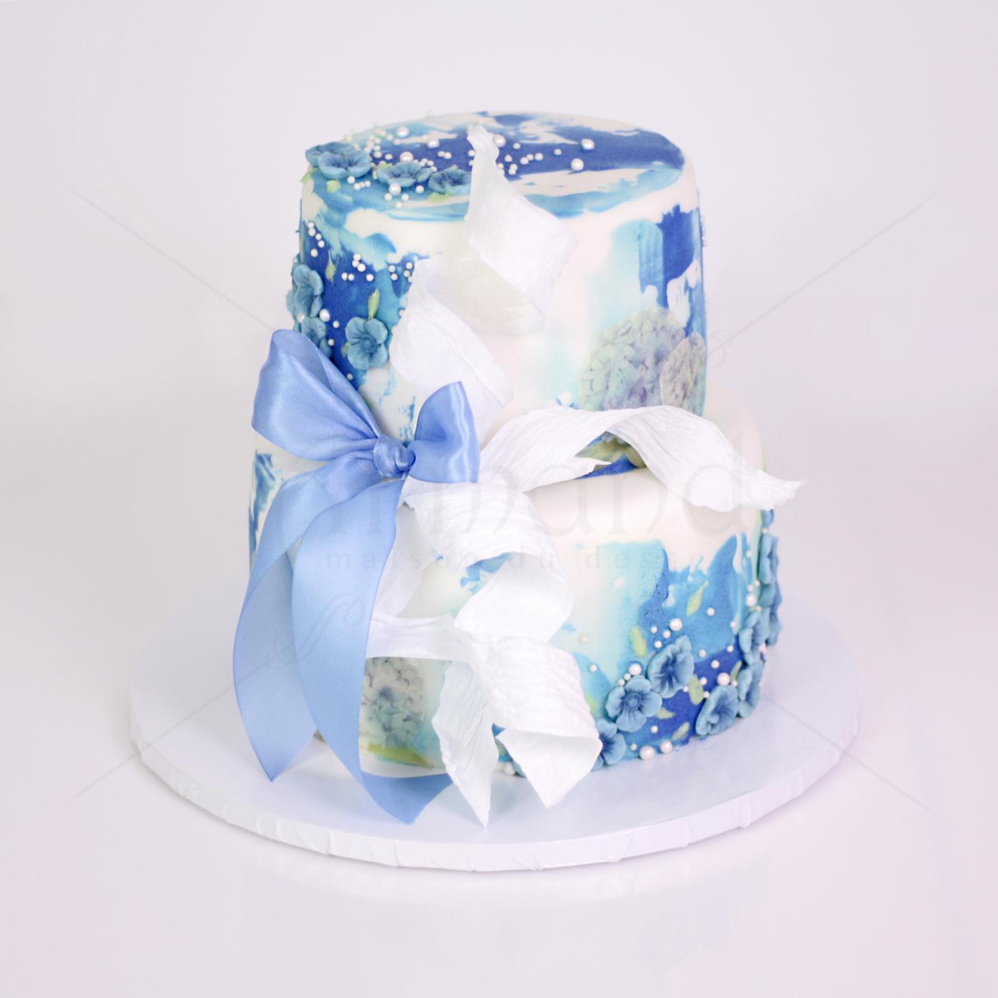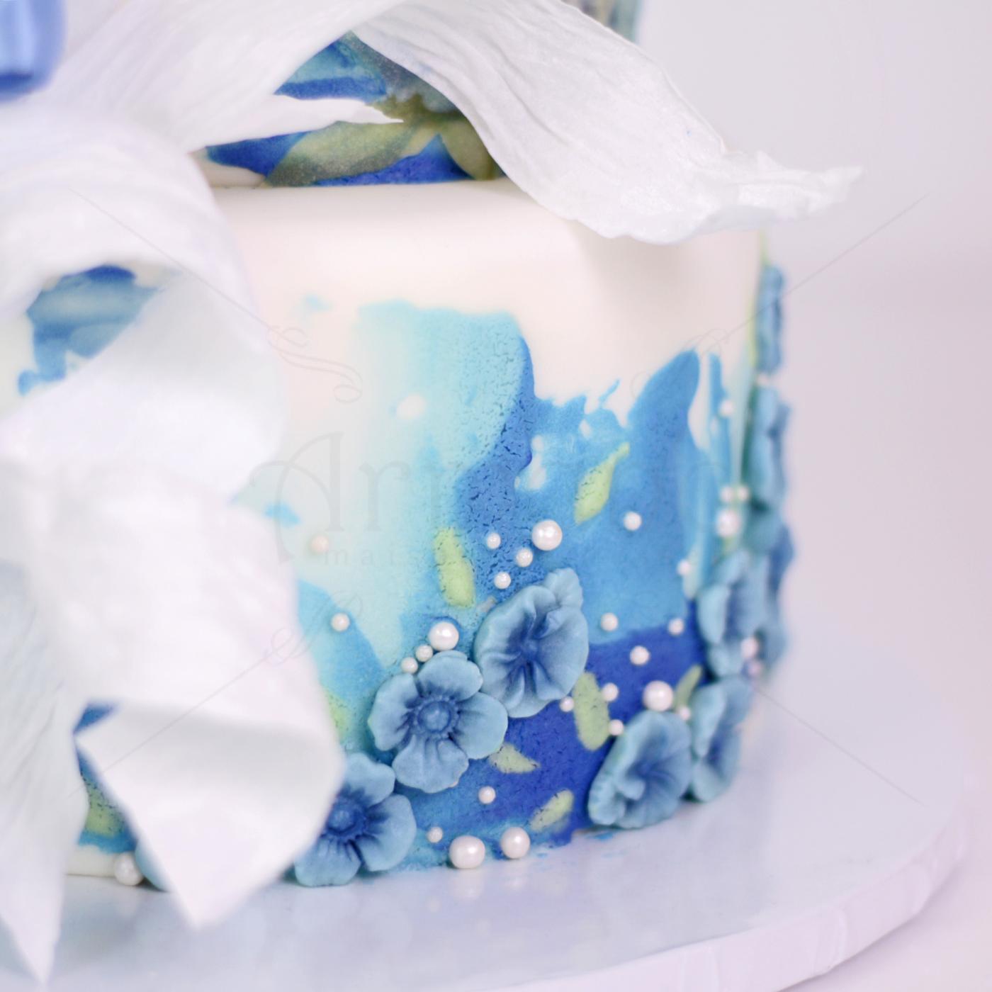 Vă invităm să admirați acest tort care este o adevărată declarație de stil și rafinament. Designul îmbină nuanțe vibrante de albastru cu un alb imaculat, creând un efect vizual de acuarelă fluidă și artistică.